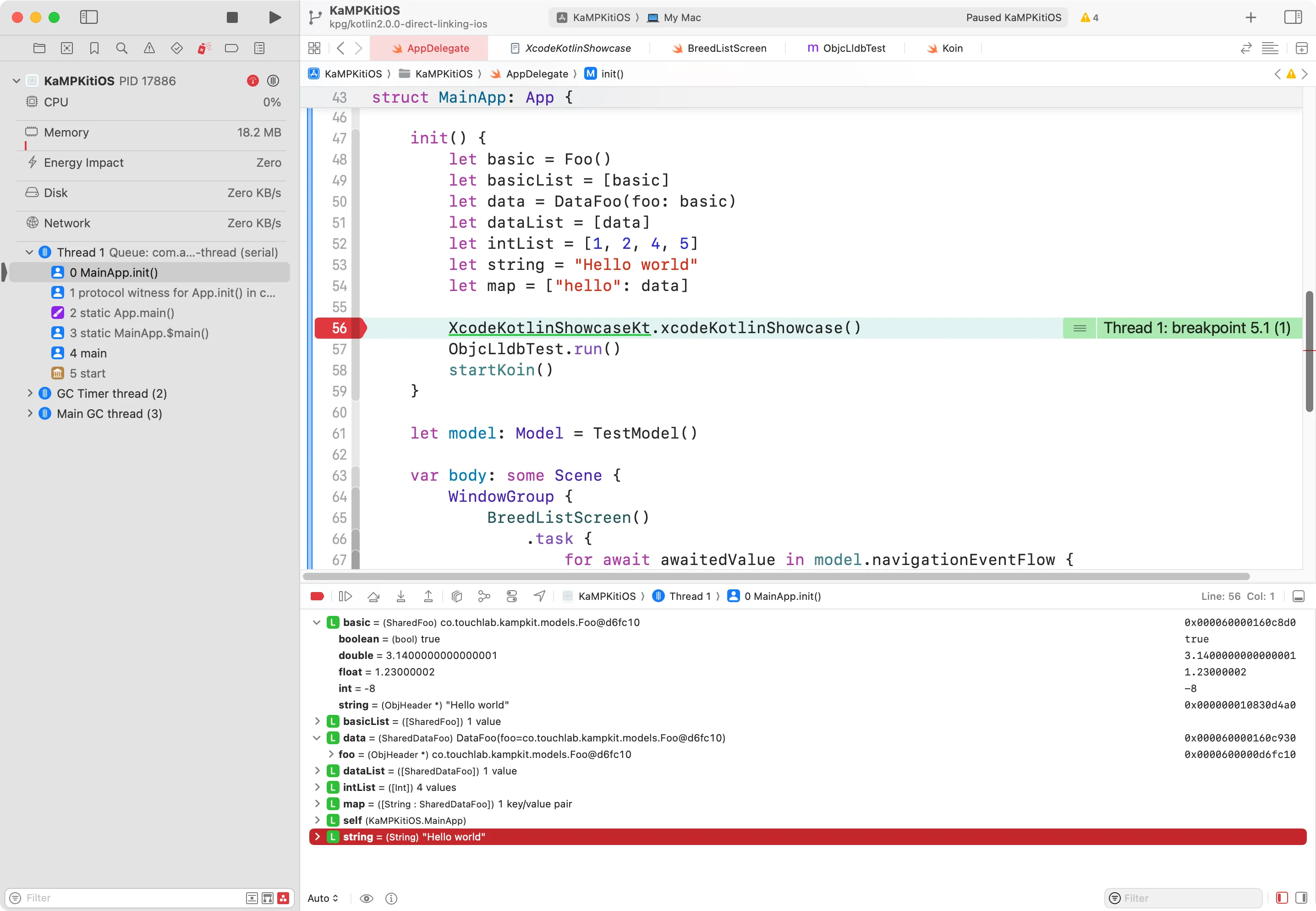 In the second screenshot, we’re stopped in Swift code. Notice the summary and fields are the same as in Kotlin code, even though the instance is a Kotlin class wrapped in an Objective-C bridging class.